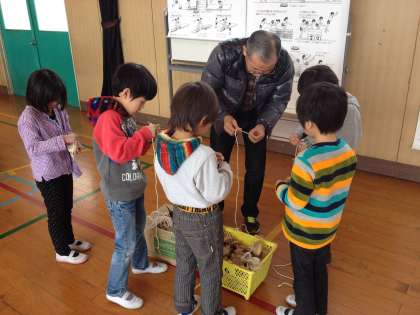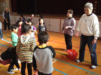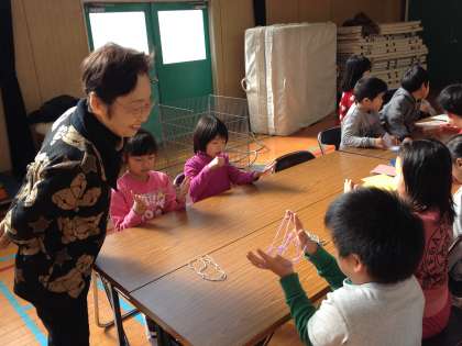 今日は、地域の「きらく会」のみなさんを学校に来ていただいて、1年生の子どもたちと遊びを通して、ふれあっていただきました。けん玉やこま回し、お手玉や羽子板は50年前は、子どもの遊びの主役でした。私たちは、こまの回し方やけん玉などは、だれにも教えてもらったことはありません。みんな、大きい子がやっているのを必死でまねて、技術を磨きました。時間はかかりましたが、そうやって体で覚えたものは、いくつになっても忘れないものです。お年寄りが上手に昔遊びをするのを見て、子どもたちは驚いていました。