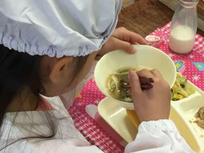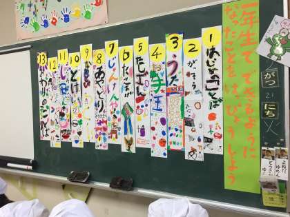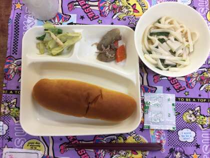 今日の給食は、なにわうどん、豚肉とごぼうの煮物、キャベツと三度豆のごまあえでした。なにわうどんというのは、あげととろろこんぶが入ったうどんでした。とろろこんぶが苦手な子もいましたが、がんばって食べていました。1年生はこの1年間で大きく成長しました。
