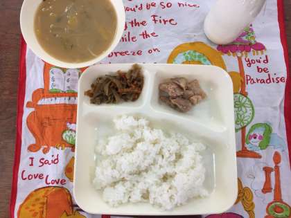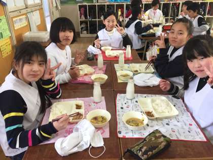 今日の給食は、鶏肉のてり焼き、さつまいものみそ汁、きんぴらごぼうでした。食欲旺盛な5年生は、いつも大盛りの給食です。