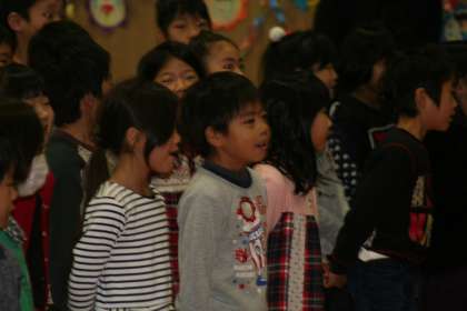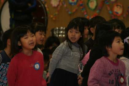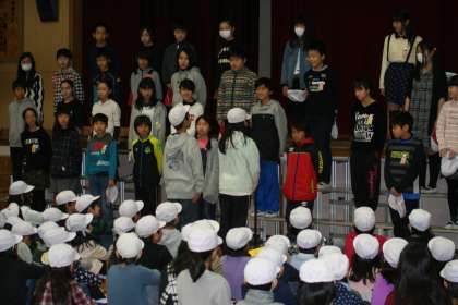 5年生の児童会が、この祝う会を企画・運営しています。まさにバトンタッチした瞬間です。1年生も「勇気100パーセント」でエールを送っていました。