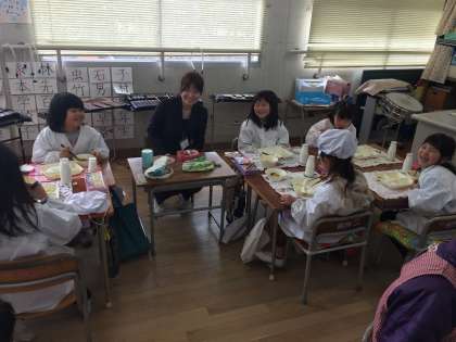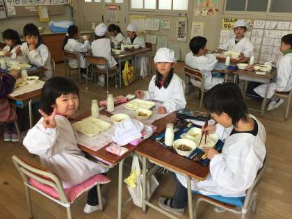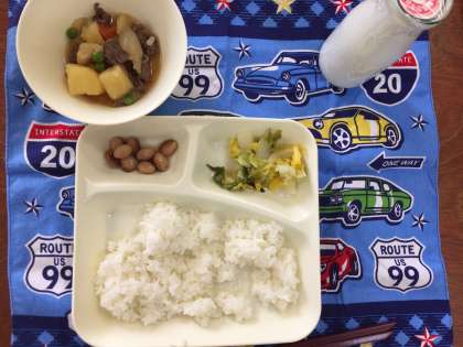 今日の給食は、肉じゃが、はくさいのゆず風味、とら豆の煮ものでした。大好きな献立の上に、松山先生にも来てもらって、1年生はニコニコでした。