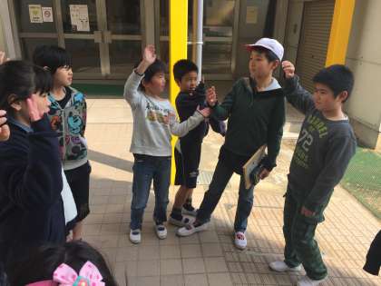 たてわり掃除のリーダーは、もう5年生です。6年生のやっていたことを、少しずつまねて、反省会でもがんばっています。