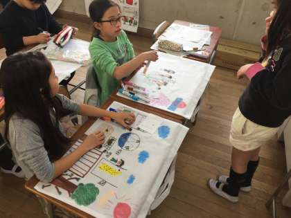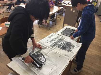 どの学年も1年間に描いた絵や版画などを持って帰る作品袋をつくっています。学年ごとに保管しておけば、小学校の想い出が残っていきます。