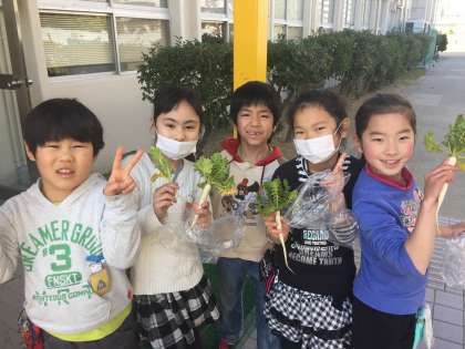 2年生が育ててきた大根ができたと見せてくれました。もうすぐ3年生で、中学年になります。楽しみですね。
