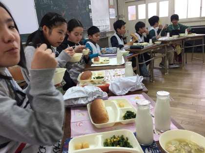 今日は6年生最後の給食でした。献立は、鶏肉と野菜のスープ煮、ホウレンソウとコーンのソテー、あげポテトもちでした。6年間、ずっと食べてきた給食です。みんなで輪になって食べました。