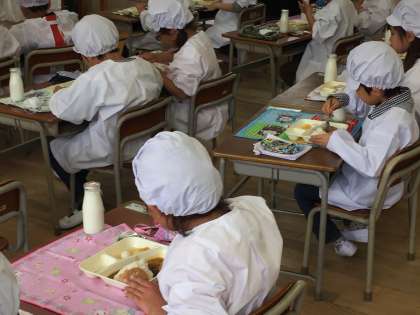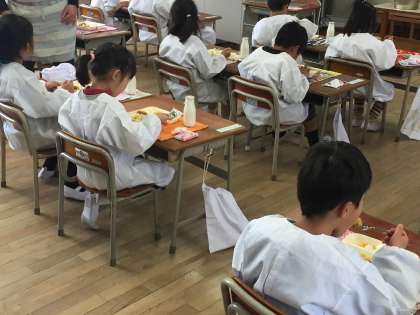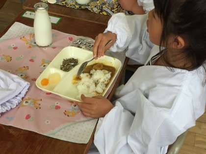 よろこんで給食を食べていました。何でも最初が大切です。食べることは体づくりにつながります。