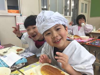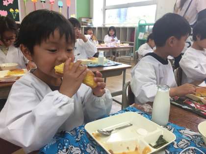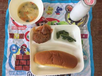 今日の給食は、煮込みハンバーグ、コーンスープ、三度豆のサラダでした。どの学年も煮込みハンバーグは、よろこんで食べていましたが、三度豆は苦手という子が多かったです。みんながんばろうね。