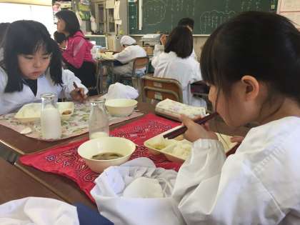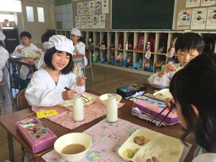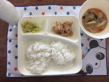 今日の給食は、鶏肉の甘辛焼き、みそ汁、キャベツの梅風味でした。鶏肉は、子どもの口には少し大きいくらいでした。キャベツとの取り合わせがさわやかでした。
