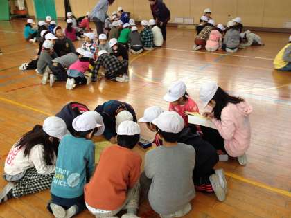 13日のたてわり集会に、6年生の姿はありません。5年生がリーダーとなって、たてわり班でお世話になった6年生に、お礼のカードをつくっています。卒業を祝う会の時に渡せるように心をこめてメッセージを書いていました。