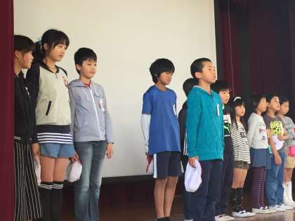 前期児童会をひっぱてくれる子どもたちが、全校児童の前であいさつをしました。みんな自分の言葉で、大きな声をだしていました。自分らしさが出ていて、とても立派でした。
