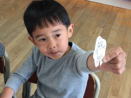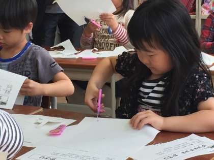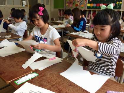 はさみをつかって、一枚の紙からどんなものができるのでしょう。1年生が挑戦していました。みんなじょうずに紙を切っていました。
