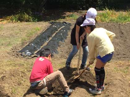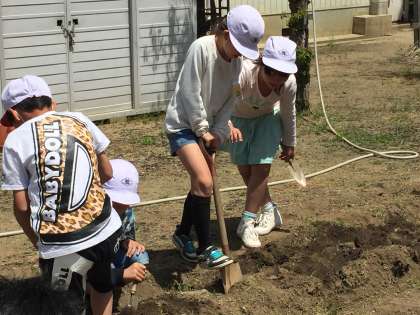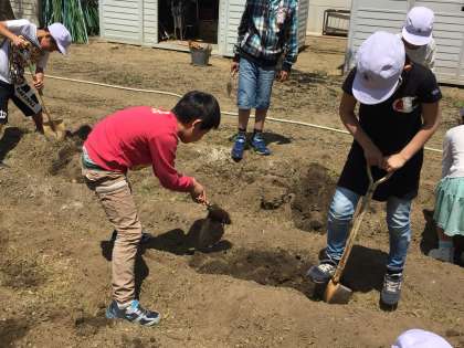 どの学年も学習園で栽培をはじめる時期になりました。何かを植えるためには、土づくりから始めます。雑草を抜いて、土を耕さないといけません。これも大切な学習です。