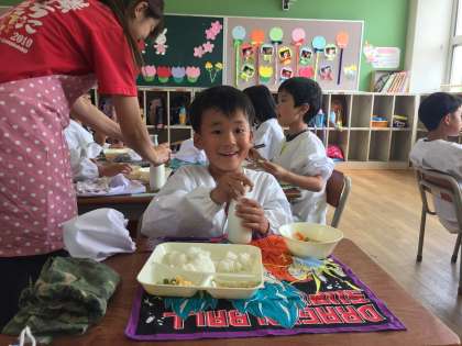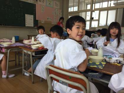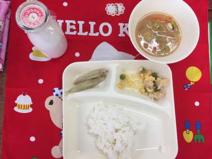 今日の給食は、きびなごの天ぷら、みそ汁、えんどうの卵とじでした。魚が苦手な子も、天ぷらにすると食べられる子も増えてきます。