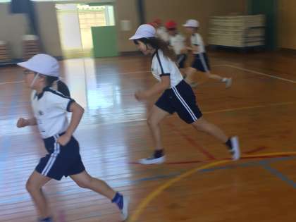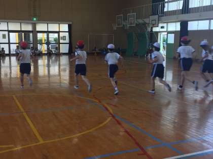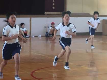 持久力を測るシャトルラン。5年生、がんばりました。自分の限界に挑戦するから伸びるのです。中途半端な気持ちでやるのではなく、へとへとになるまで、やり通しました。