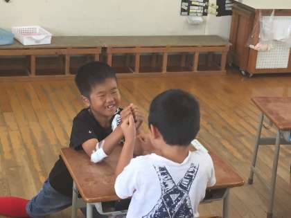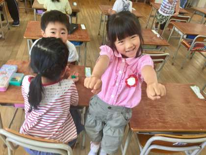 5個のおはじきを左右の手のひらに分けて握って、「3つは、どっち?」とか「右手はいくつ?」とか言いながら、友だちといっしょに算数の学習をしていました。