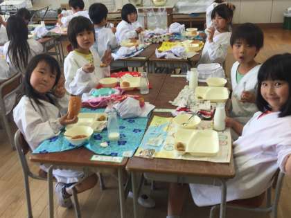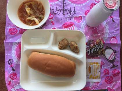 今日の給食は、一口トンカツ、ミネストローネ、アーモンドフィッシュでした。マーマレードやアーモンドフィッシュは、1年生にとっては手ごわい相手です。なかなか上手に袋を開けることができません。「先生、開けてください」が何人もいました。