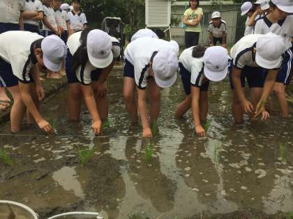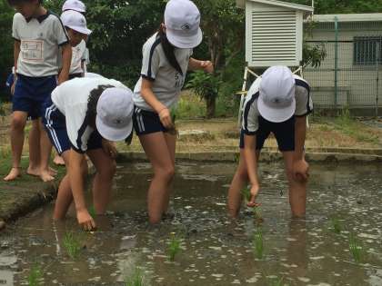 5年生が雑草を抜いたあとに水をはり、田植えができるようになりました。今日は、いよいよ苗を植えました。水田に入るのは、はじめてという子が大半ですから、それだけでおおさわぎです。