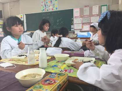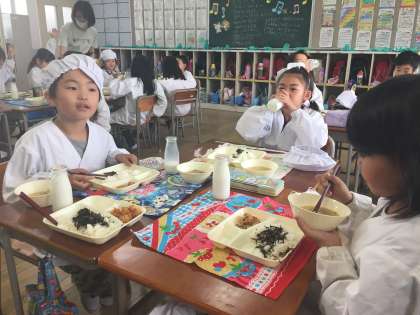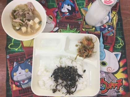 今日の給食は、さけの野菜たっぷりあんかけ、みそ汁、まぜまぜふりかけでした。まぜごはんが好きな子が多く、さけのあんかけもおいしかったので、大好評でした。