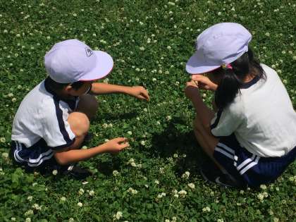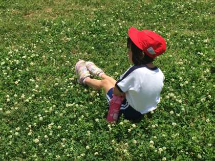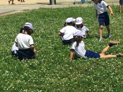 芝生広場は、一面にシロツメクサが広がっています。ここでは、のんびりと寝転ぶ子がいます。草のかおりもホッとした気分にしてくれます。創立30周年を記念してつくったこの広場は、今も子どもたちの憩いの場になっています。