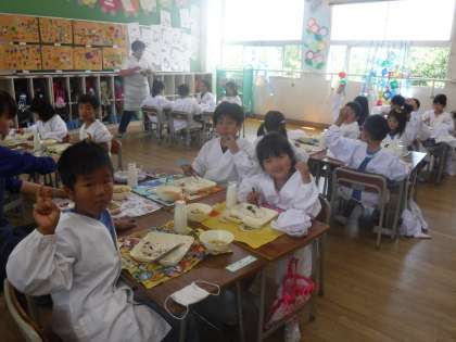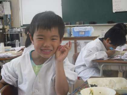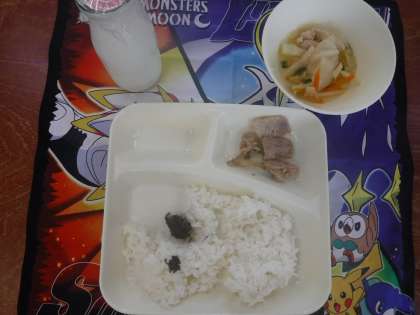 今日の給食は、豚肉のごまみそ焼き、すまし汁、のりのつくだ煮でした。鶏肉もつくだ煮も、ごはんのお供に最適です。食欲が落ちてくる季節には、ぴったりな献立です。