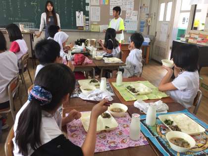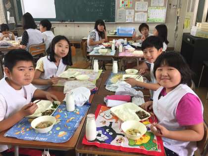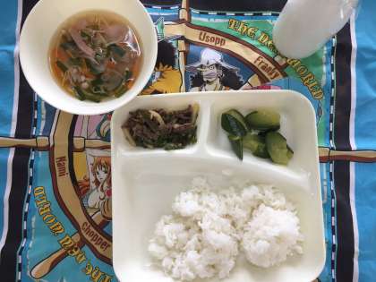 今日の給食は、チンジャオニューロウスー、ハムと野菜の中華スープ、きゅうりの辛みづけでした。お肉と中華スープですから、人気のメニューです。今日もごはんがすすむ献立でした。