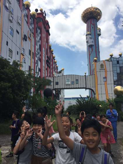 ウィーンの芸術家、フンデルトヴァッサー氏によってデザインされた舞洲工場は、ごみを焼却する施設というよりも、自然との調和をめざして作られたすばらしい芸術作品です。子どもたちは、大満足で見学を終えることができました。