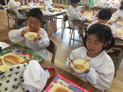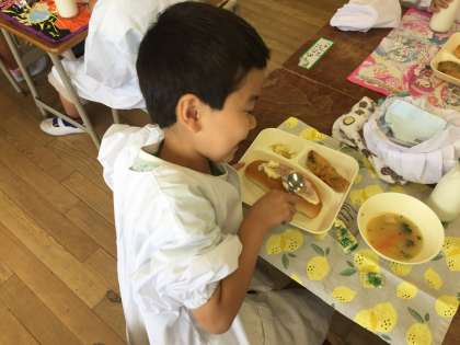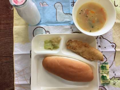 今日の給食は、サーモンフライ、コーンスープ、キャベツのソテーでした。からっとあがったサーモンは、サクサクでおいしかったです。
