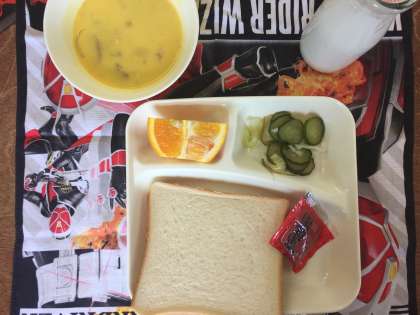 今日の給食は、かぼちゃのクリームシチュー、ミックス海そうのサラダ、オレンジでした。クリームシチューがまったりとして、とてもおいしかったです。