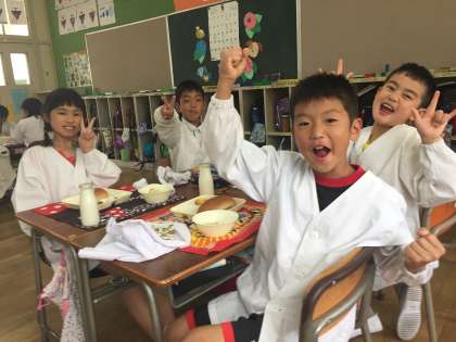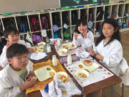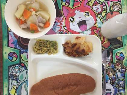 今日の給食は、鶏肉と野菜のスープ煮、カレーソテー、ミックスフルーツのクラフティでした。クラフティを早く食べたいので、パンを減らす子が多かったです。