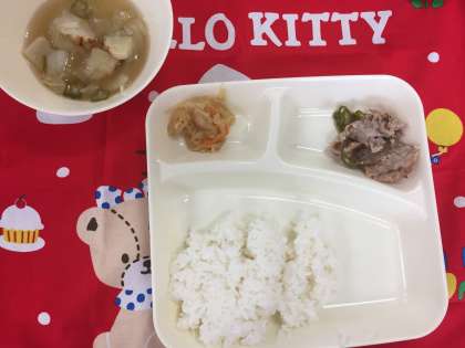 今日の給食は、豚肉の梅風味焼き、すまし汁、切り干し大根のいため煮でした。かなり蒸し暑くなってきましたが、エアコンのおかげで食欲も落ちていません。月曜日からは、7月の献立になります。