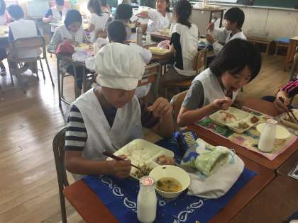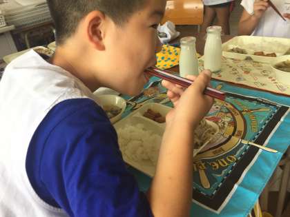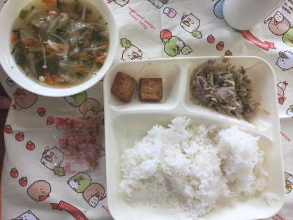 今日の給食は、ゴーヤチャンプル、五目汁、あつあげのしょうが醤油かけでした。ゴーヤが人気で、山盛りにして食べている子がたくさんいました。