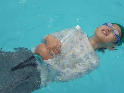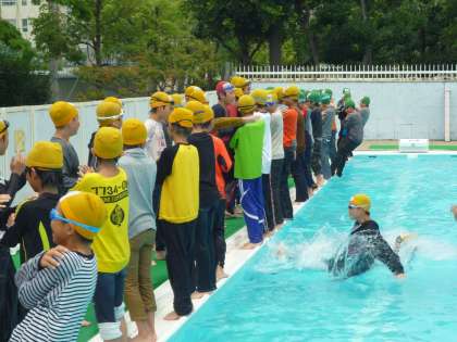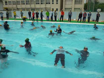 水難事故や洪水など水の中に落ちる場合を想定して、衣服を着て水泳をするのが着衣水泳です。ここでは泳ぐことではなく、浮かぶことを教えています。