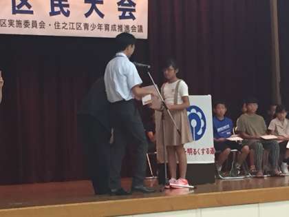 社会を明るくする運動、住之江大会において、非行防止の標語で表彰式がありました。本校の児童も住之江区民ホールで西原区長より表彰状をいただきました。