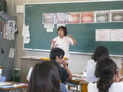 14日(金)の3時間目。6年生は歯科衛生管理の先生から、歯と口の健康について指導を受けました。歯周病についての説明を聞いた後、一人ひとり手鏡をもって、自分の歯茎の状態を確かめました。6年生でも多くの子どもたちが歯周病にかかっているのが実態です。みんなおそるおそる自己チェックして、先生から「だいじょうぶです」と言われると、ホッとした表情を浮かべていました。歯茎の状態は、正しい歯磨き習慣でみるみる改善します。どうか、お家でも「食べたら磨く」を実行してください。
