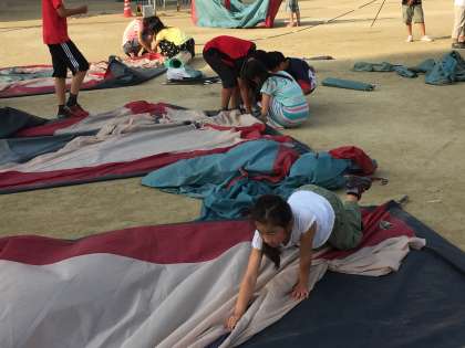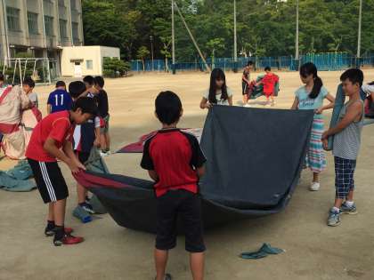 テントの片づけも男女でいっしょにやります。小さな子もやり方を教えてもらいながら、きちんとたたんでいました。