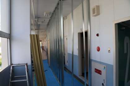 西側トイレ(1階から4階)の改修工事が始まっています。今は、トイレをボードで囲ってしまう工事をしています。