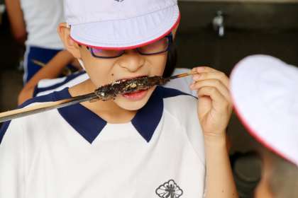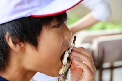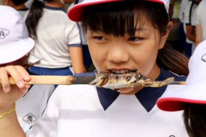 焼きたての魚は美味しいです。はじめはこわごわでしたが、食べ始めるとムシャムシャとかぶりついていました。
