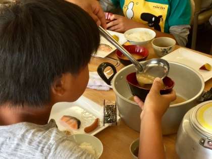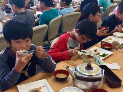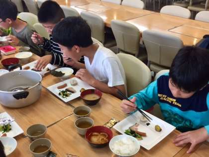 7時30分、朝食を食べました。みそ汁とごはんが、山登りの力になります。しっかり食べていました。