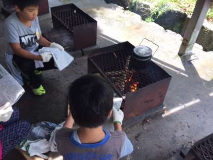 薪がしめっていることもあって、なかなか火がつかないグループもありました。これもいい経験です。こんな場合には、薪を乾かしながら火をつけることを学びました。