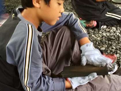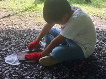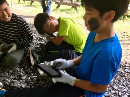 焼いた板をタオルでこすり、すすを取れば光沢のある木目が現れます。そこまで、しっかりとこすります。