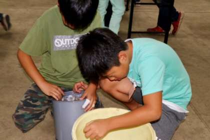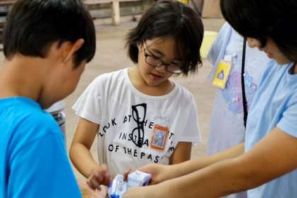 ミルク、バニラエッセンスを入れてかき混ぜるます。しっかりと容器にふたをして、氷の入ったケースに入れます。氷には塩をかけて、ケースのふたを閉めました。