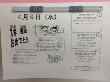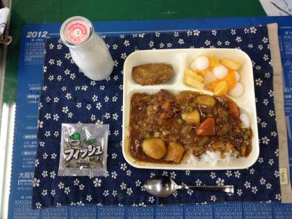 今学期最初の給食は、入学・進級お祝い献立でした。内容は、「カツカレー、フルーツ白玉、ミニフィッシュ」です。子どもたちが大好きなメニューで、どの学年でも好評でした。