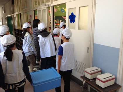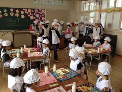 6年生は、入学して間もない1年生のために給食を教室まではこび、配膳するのが本校の伝統です。この活動を通して、給食の運び方や配膳の仕方を教えるとともに、親交も深まります。このつながりは、卒業まで続きます。