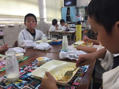 今日の給食は、チキンカレーでした。ピクルスとみかんゼリーもついていました。どのクラスも食缶が空になっていました。スプーンもきれいになるくらい、きれいにいただきました。