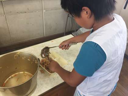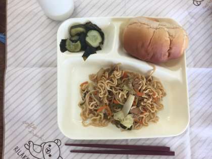 焼きそばとパンときたら、焼きそばパンです。クラスに何人かは、じょうずに焼きそばパンをつくって食べています。食缶はきれいに空っぽでした。