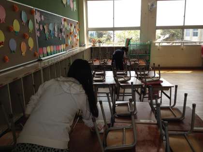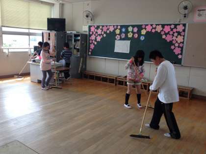 1年生が帰った後の教室を掃除しているのは、6年生です。自分たちの教室以上に、ていねいに掃除をしてくれています。明日、1年生たちは6年生がきれいにしてくれた教室で朝を迎えることになります。