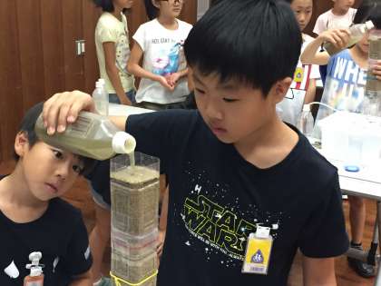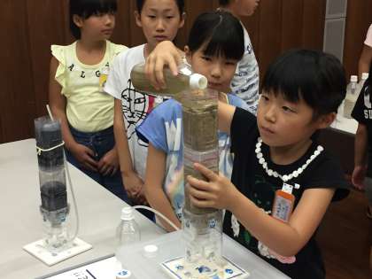 4年生が、柴島浄水場を見学しました。砂や活性炭だけで、泥水がきれいになる実験をやりました。みんなとても驚いていました。