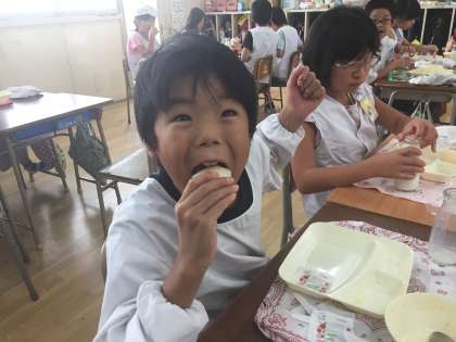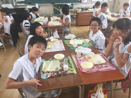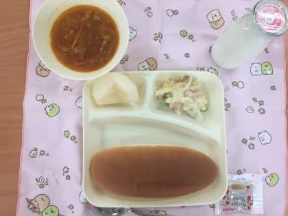 今日の給食はえびグラタン、トマトスープ、なしでした。二十世紀なしが、さっぱりとしておいしかったです。秋の味覚です。