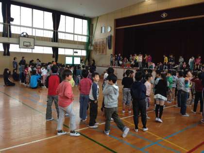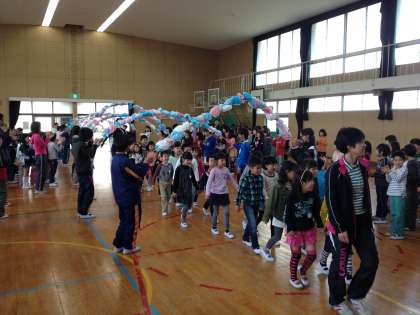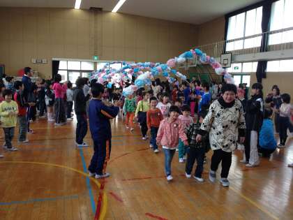 今日は1年生が入学して、はじめて全校の児童と顔をあわせる対面式をしました。お花のアーチをくぐって、講堂の舞台に立った1年生。ちょっぴりドキドキでした。児童会の代表から、歓迎の言葉をもらった後は、「光小クイズ」です。「池の数は2つですか?」と聞かれても、困ってしまう1年生ですが、上級生の反応にあわせてクイズに参加していました。こんな活動をくりかえしていく中で、少しずつ学校生活に慣れていきます。