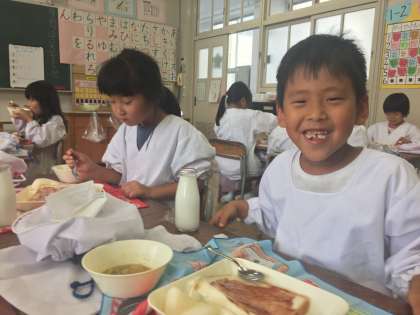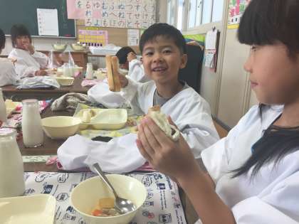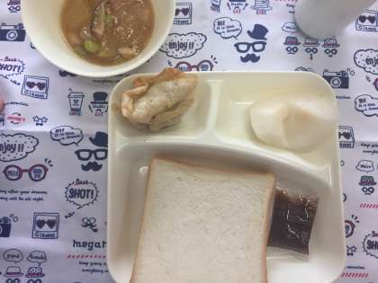 今日の給食は、揚げぎょうざ、鶏肉ととうがんの中華煮、なしでした。揚げぎょうざが気に入った子が多くて、後に残しておいて食べると言っていました。皮がパリッとしていておいしかったです。